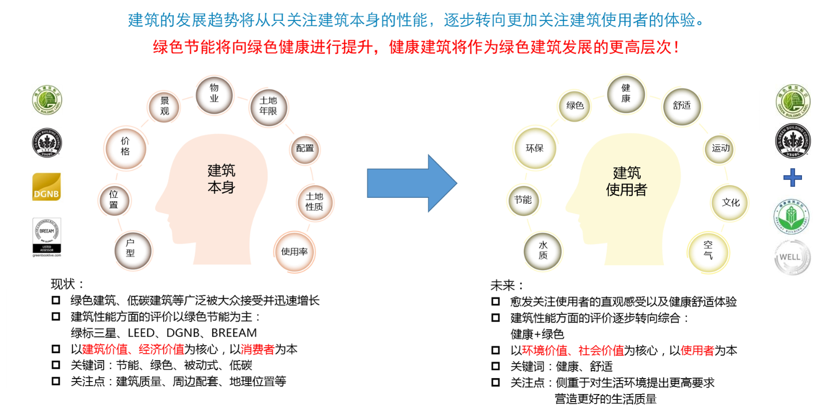 当今住宅的发展趋势已从原本只关注建筑本身的性能,逐步转向更加关注建筑使用者的体验感和健康性,从绿色节能向绿色健康进行提升,健康建筑将作为绿色建筑发展的更高层次!