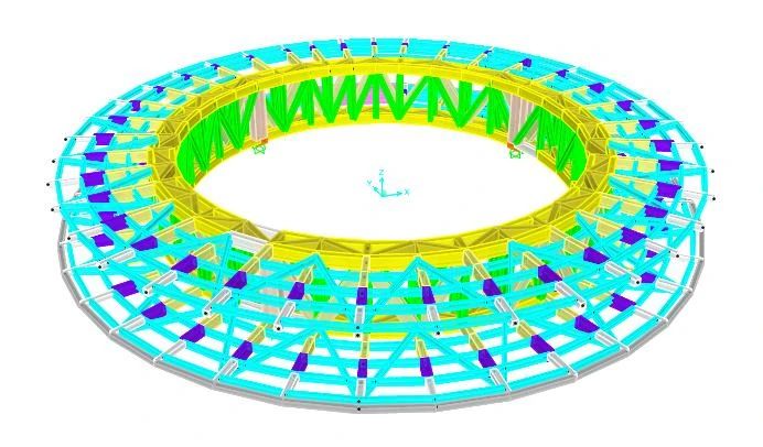 我们的工程师经过多方案对比,最终选择采用空间钢结构来实现观景环廊。在内环设置约1.5米宽、5.9米高的环形空间钢桁架,钢桁架下设三个支点,与下部混凝土结构相连。支点处的桁架竖腹杆加粗,直接深入下部混凝土结构当中,既保证了支座的安全性,又将钢结构的支点巧妙的“藏”了起来,轻松实现漂浮感。环形空间钢桁架分约36节,根据建筑布置基本均分网格。桁架外侧设辐射状钢梁悬挑近8.5米,辐射状钢梁间设次梁,铺设钢筋混凝土板。