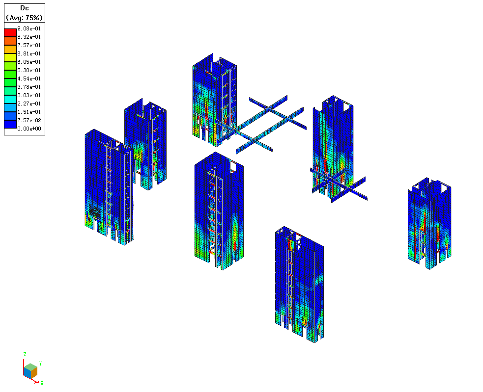 结构加固方案优化及消能器深化设计是本项目的工作重点。改造团队联合公司消能减震研发团队,采用减震技术对方案进行了优化,消能器采用屈曲约束支撑(BRB)及黏滞阻尼器(VFD),项目中通过设置BRB增强结构层间刚度同时调整结构扭转效应,通过设置VFD为结构提供附加阻尼比,从而进一步减小地震作用,优化结构加固工程量。该加固项目中采用较大吨位BRB,深化设计中优化结构加固节点,避免了传统锚固节点对梁、柱构件造成二次损伤的问题,优化后层间变形及地震剪力均小于原方案,同时结构减震效果也优于原建筑设计。