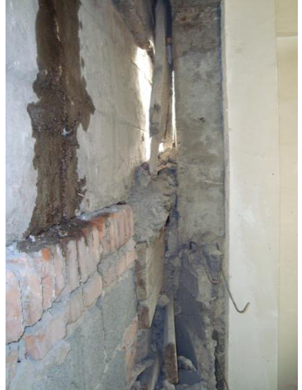 (a) 防震缝宽度不够,高低建筑相互碰撞造成墙体破坏