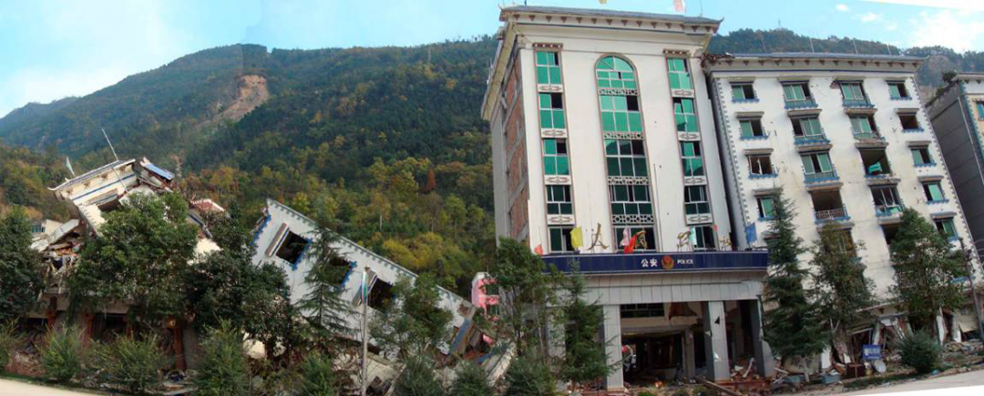 北川县公安局办公楼与两侧宿舍楼碰撞,导致西侧宿舍楼倒塌,并引起西侧其他建筑的连续倒塌。