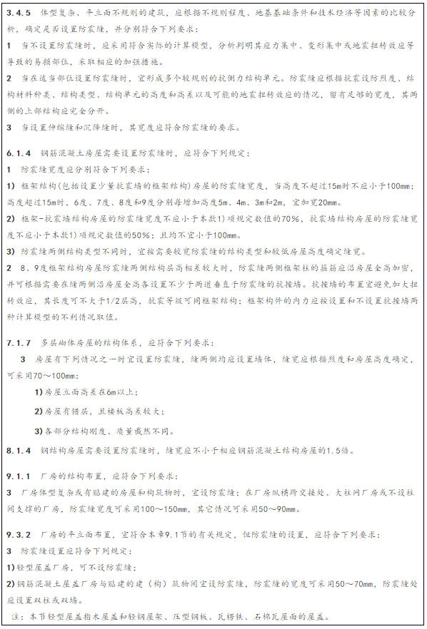 我国的10规范(《建筑抗震设计规范》GB 50011-2010)在第3.4.5条给出了防震缝设置的一般规定,同时,在第6.1.4条、7.1.7条、8.1.4条、9.1.1条和9.3.2条等处分别对钢筋混凝土房屋、砌体结构房屋、钢结构房屋、钢筋混凝土厂房以及单层砖柱厂房等防震缝设置进行了规定。