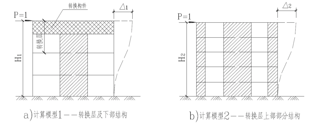 图E 转换层上、下等效侧向刚度计算模型 E.0.3 当转换层设置在第2层以上时,按本规程(3.5.2-1)式计算的转换层与其相邻上层的侧向刚度比尚不应小于0.6。 |
