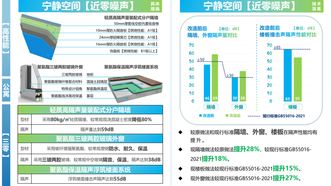 在宁静空间·近零噪声方面,项目运用轻质高隔声量装配式分户隔墙、聚氨酯三玻两腔玻璃外窗、聚氨酯保温隔声浮筑楼面系统,实现近零噪声。