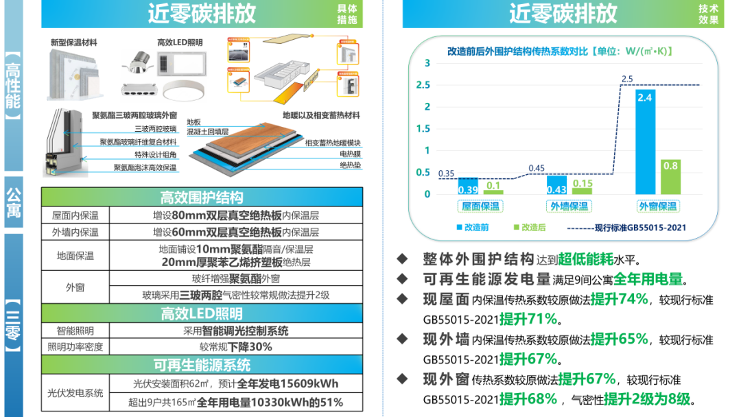 在近零碳排放方面,项目全面提升围护结构保温性能,提高可再生能源发电效率,结合能碳双控系统,实现近零碳空间。