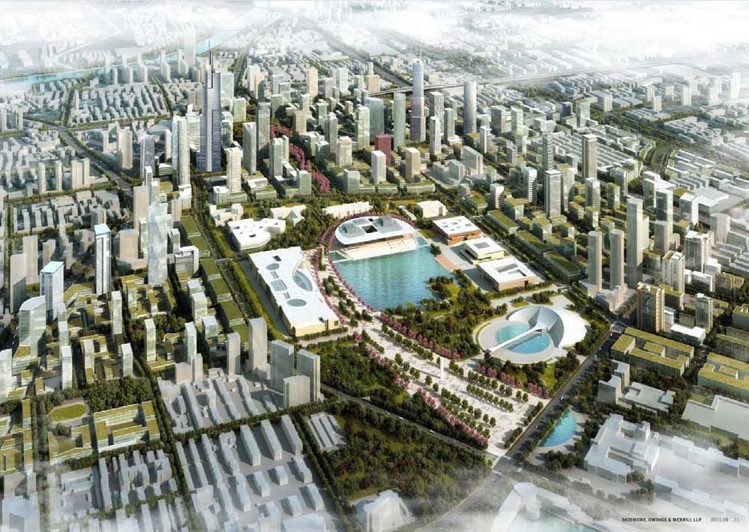 利用银河公园与现状乐园的绿化、湖面形成开敞空间,从天津大礼堂向东延伸景观轴线,在轴线底景布置天津大剧院,面向湖面,与水景相映成趣。在湖面南侧,结合现状保留的天津博物馆(改建为自然博物馆)与中华剧院,自西向东依次布置天津博物馆、天津美术馆、天津图书馆,形成文化带;在湖面北侧,布置天津乐园。规划中的南侧文化带建筑端庄典雅,北侧天津青少年活动中心、天津乐园活力动感,两侧建筑的尺度设计和材质运用相互协调、呼应,烘托出天津大剧院清新大气的主体地位。在交通组织方面,设计方案充分考虑区域人流集散特点,依据区域道路交通网络,中心城区4条轨道交通线路将服务于文化中心,实现便捷高效的公共交通服务,保证人流的快速集散;同时,完善周边地区道路网络,并结合地下空间开发,为项目提供有力的交通保障。文化中心以“文化、人本、生态”为主题,充分展示天津大气、洋气、和谐、现代的靓丽形象。