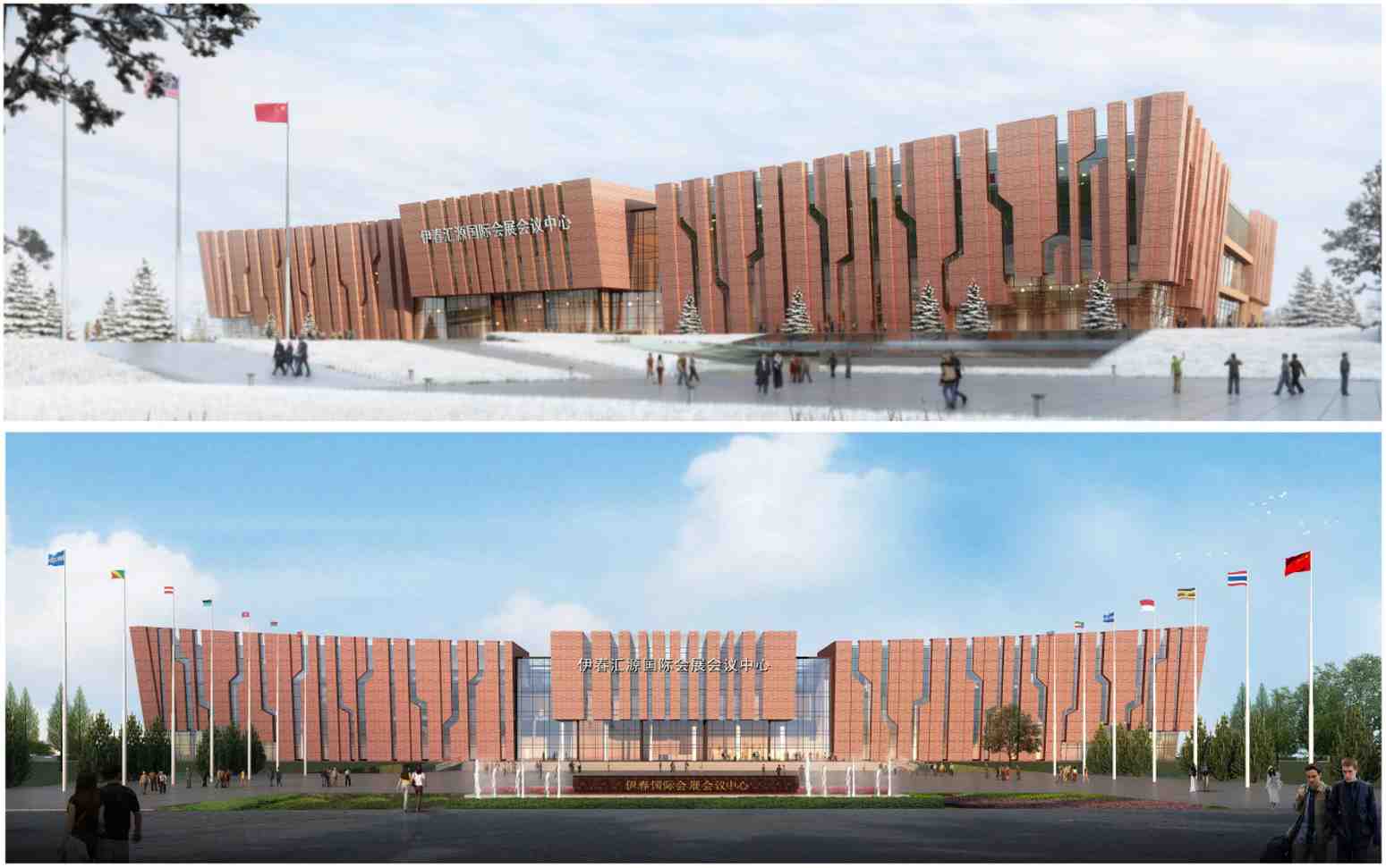 会展中心可概括为三个部分构成,主展厅区域,会议剧场区域,办公配套区域。主展厅区域包括前厅,两个主展厅,一个专项展厅,其中专项展厅为两层。会议部分包括一个600人的剧场及若干个中小型会议室、报告厅。在建筑的基座层设有一个300人的学术报告厅。办公配套区域的基座层设有商业、设备用房、内部食堂等,首层为商业,二层为会议配套的餐饮区,三层、四层为内部办公用房。