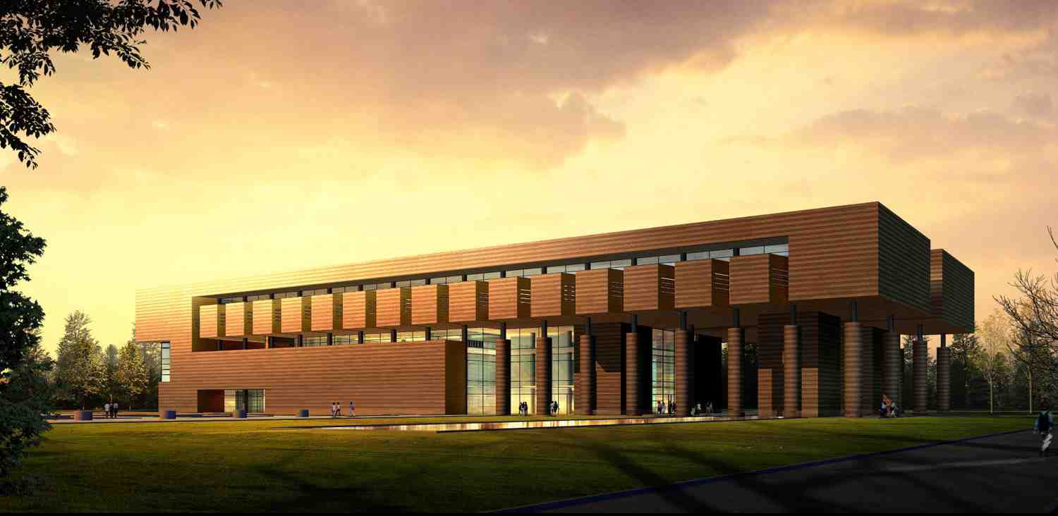 总平面布局设计结合校园总体规划及周边环境,充分考虑地段的合理化、最大化应用,将建筑平面布置为东西向长、南北向短的矩形。建筑东部结合入口布置高度为14.3米的大型室外柱廊,与南侧美术学院广场及东侧城市绿化带形成空间的延续及景观上的渗透,并将室外空间有效的引入了室内接待门厅。参观人流可以从南、北、东三个方向方便的进入博物馆。建筑设计具有典型的“提契诺学派”建筑设计风格:采用“减法”的设计思路,从整体巨石中雕刻出体量简洁、虚实对比强烈的建筑形体。注重自然光线在建筑室内、室外的运用,体现了建筑简洁、明确、有力而内向的建筑风格。