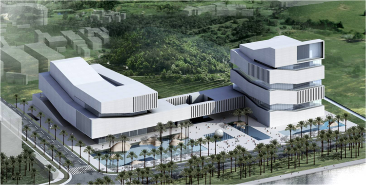 珠海博物馆的水平造型与内陆的山区景观相互呼应,城市规划馆则成塔状,面向珠海湾。规划馆位于塔状建筑内,螺旋状的体量沿立方体状的塔楼盘旋而上,不但使建筑造型极富立体感,而且体现出建筑内部的流线,功能分区清晰明确。城市规划展览馆与博物馆相连,将螺旋状的流线融入到宽阔的建筑体量中,高度适中,以提供连贯宽敞的展览空间。博物馆和城市规划展览馆的功能独立,同时又相互连接,因此可以共享公共功能空间。