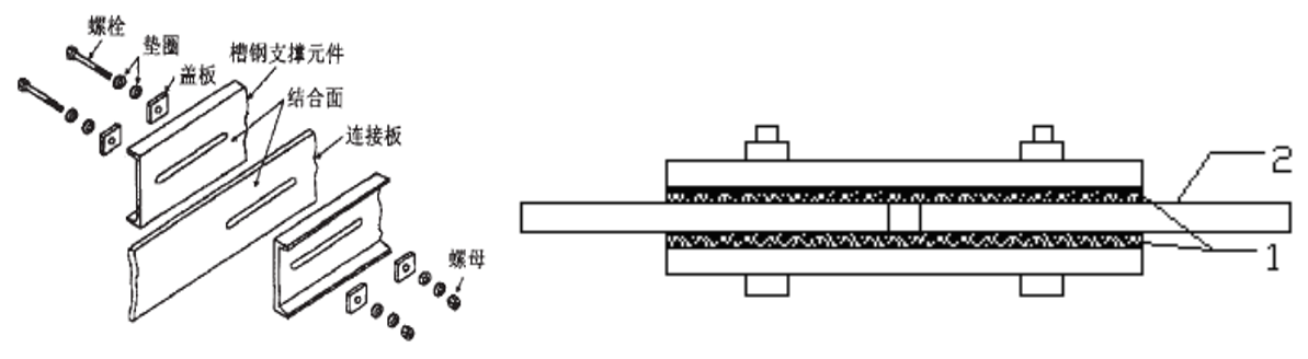 普通摩擦消能器的核心部件如图3所示。是通过开有狭长槽孔的中间钢板相对于上下两块铜垫板的摩擦运动而耗能,调整螺栓的紧固力可改变滑动摩擦力的大小。滑动摩擦力与螺栓的紧固力成正比,另外,钢与铜接触面之间的最大静摩擦力与滑动摩擦力差别小,滑动摩擦力的衰减也不大,保证摩擦耗能系统工作的稳定性。