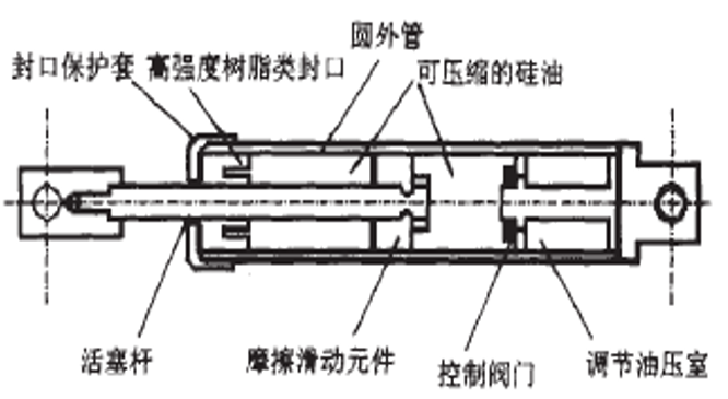 液缸式黏滞消能器的结构构造主要沿用机械液缸的结构,其外缸及活塞尺寸已经形成系列化。根据构造的不同可以分为单出杆流体消能器、双出杆流体消能器和液压缸间隙式流体消能器。液缸式消能器一般由缸体、导杆、活塞、阻尼孔和黏滞流体阻尼材料等部分组成(图4)。活塞在缸体内做往复运动,缸体内装满阻尼流体,活塞上有小孔成为阻尼孔。当活塞与缸体壁发生相对运动时,活塞的前后压差使阻尼流体从阻尼孔中流过,产生阻尼力。