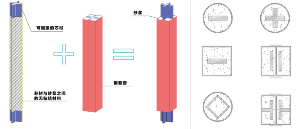 屈曲约束支撑由芯材,无粘结填充材料、约束外套筒组成