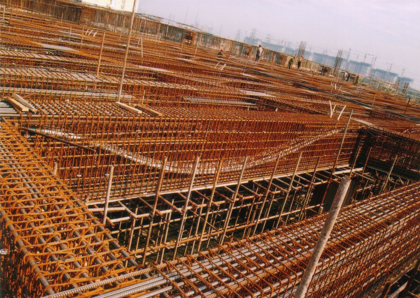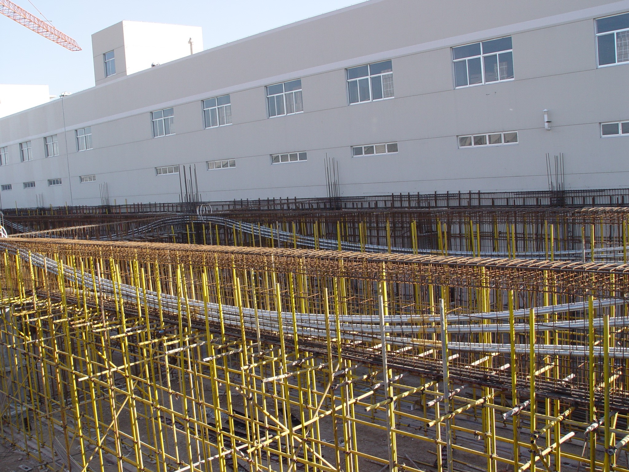 预应力设计及施工。大平台框架主梁及次梁采用了无粘结及有粘结预应力技术,解决大跨重载问题,钢绞线用量近2000t,完成预应力设计与施工。